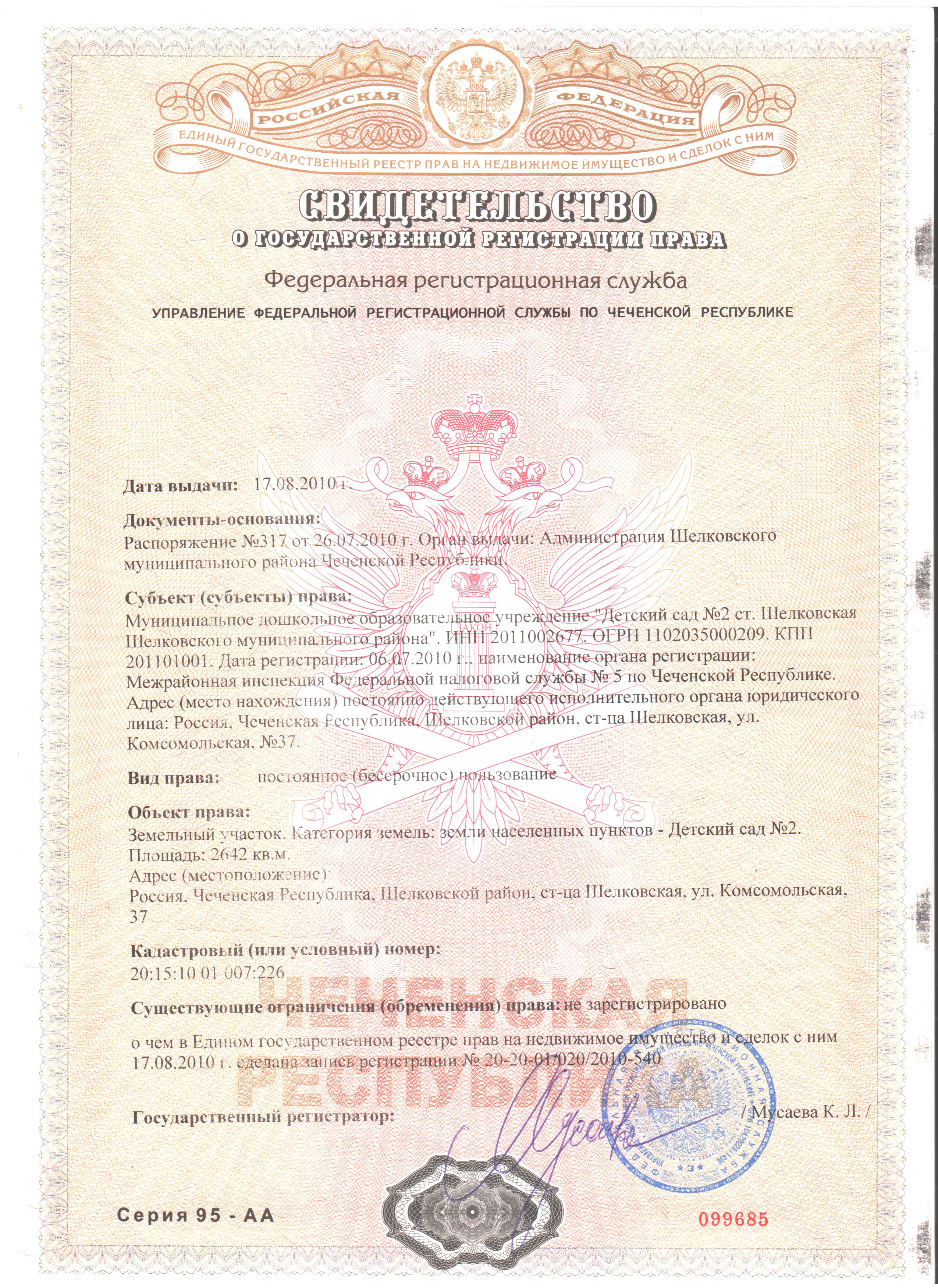 Свидетельство о государственной регистрации права (документ о закреплении территории)